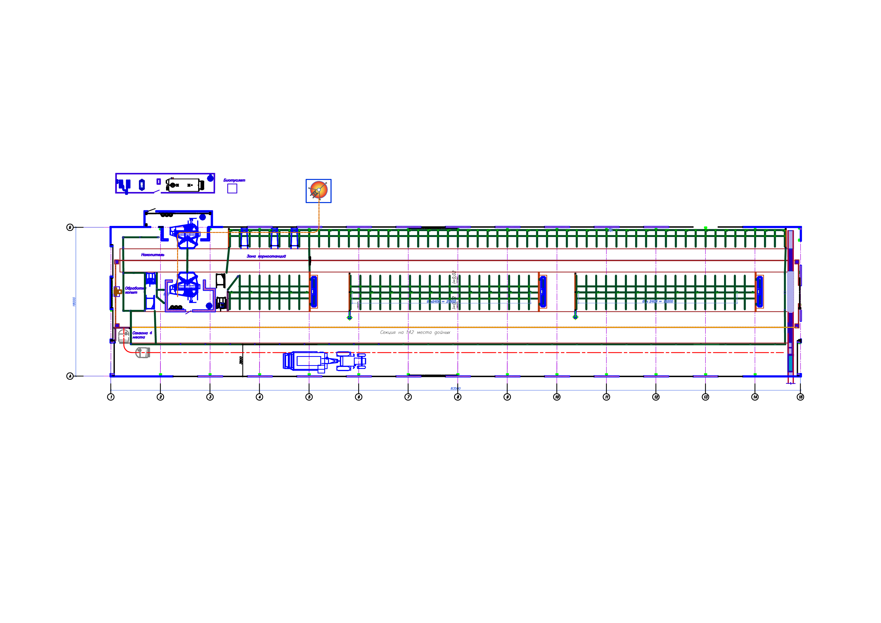 Всего в коровнике запроектировано 146 мест: - одна групповая секция для лактирующих коров на 142 места, и санзона на 4 места.